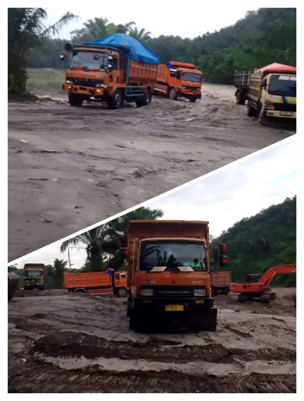 “Iya bang, setiap hari ratusan mobil truk masuk mengangkut pasir. Gimana mau kami larang, pengusahanya orang sini dan katanya ada yang mem-back up. Kami rakyat kecil takut untuk protes,” ujarnya.