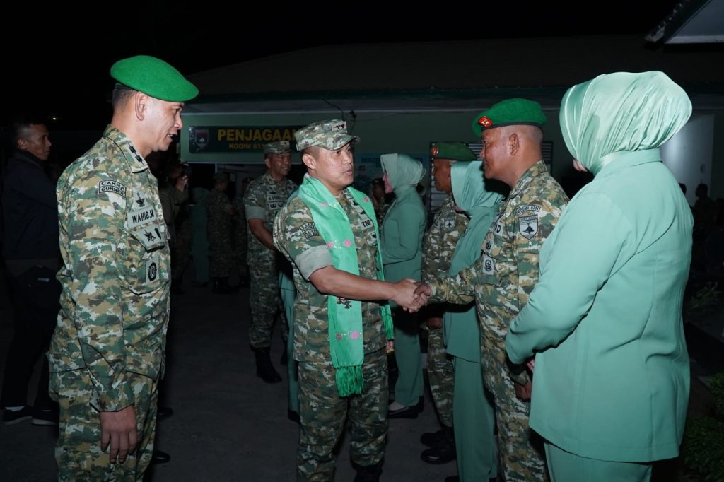 RIAUVIRAL.COM,INHIL.-Komandan Kodim (Dandim) 0314/Inhil, Letkol Arm Wahib Mustofa Fathurrahman, M.Han., beserta jajaran menyambut kedatangan Panglima Komando Daerah Militer (Pangdam) XIX/Tuanku Tambusai (TT), Mayjen TNI Dr. Agus Hadi Waluyo, S.A.P., M.M., CHRMP. di Markas Kodim (Makodim) 0314/Inhil, Kabupaten Indragiri Hilir, Provinsi Riau, Senin (9/3/2026) malam.