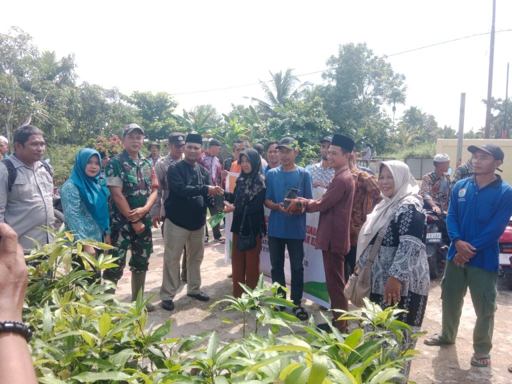 Penyaluran bibit tanaman berupa Mangga,kelengkeng dan palawija kepada warga dihalaman kantor Desa Gemilang Jaya, Jumat (10/10/2025)